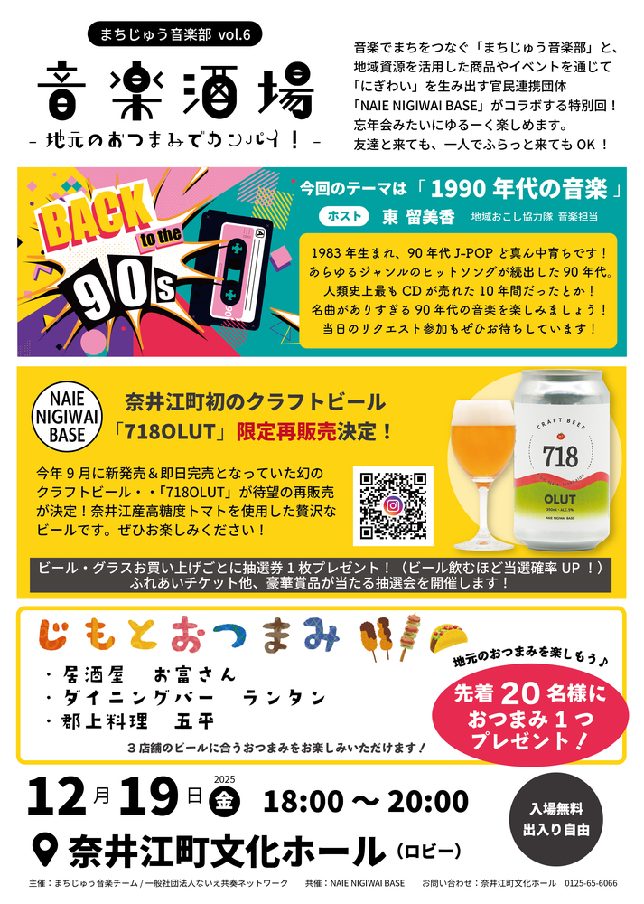 音楽でまちをつなぐ「まちじゅう音楽部」と、 地域資源を活用した商品やイベントを通じて 「にぎわい」を生み出す官民連携団体 「NAIE NIGIWAI BASE」がコラボする特別回! 会場では今年9月に新発売&即日完売となっていた町産トマトを使ったクラフトビール・・「718OLUT」が待望の再販売 が決定!ぜひお楽しみください!